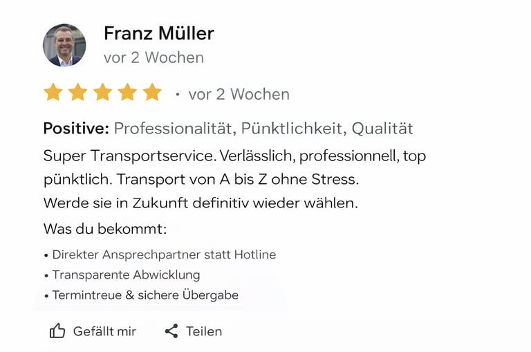 Wir holen pünktlich ab, transportieren sicher und schließen den Auftrag sauber ab.